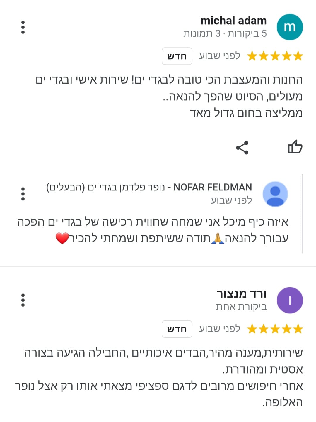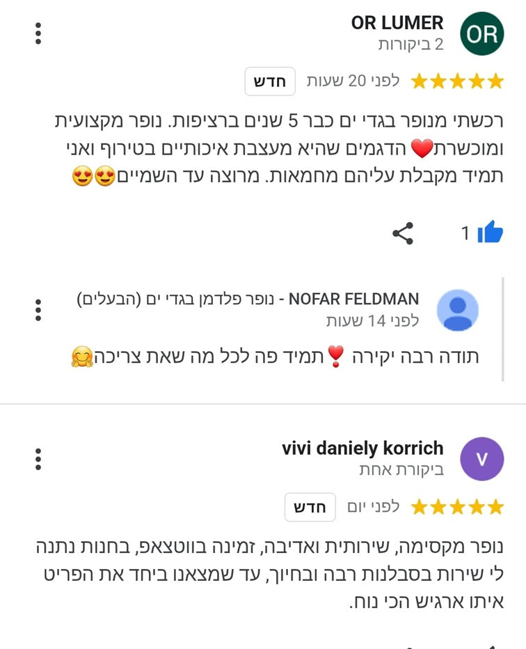 היי נופר, קיבלתי הרבה מחמאות על בגד הים והחוף שהזמנתי! כבר שלחתי את האתר שלך לחברות שלי השירות שלך לא מובן מאליו! אנחנו ניפגש שוב בקרוב ♥︎