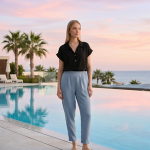 מכנס חוף קליל ושקוף מבד שיפון רך ונשפך, מושלם ללבישה מעל בגד ים ליצירת לוק חופשה אלגנטי וקליל.